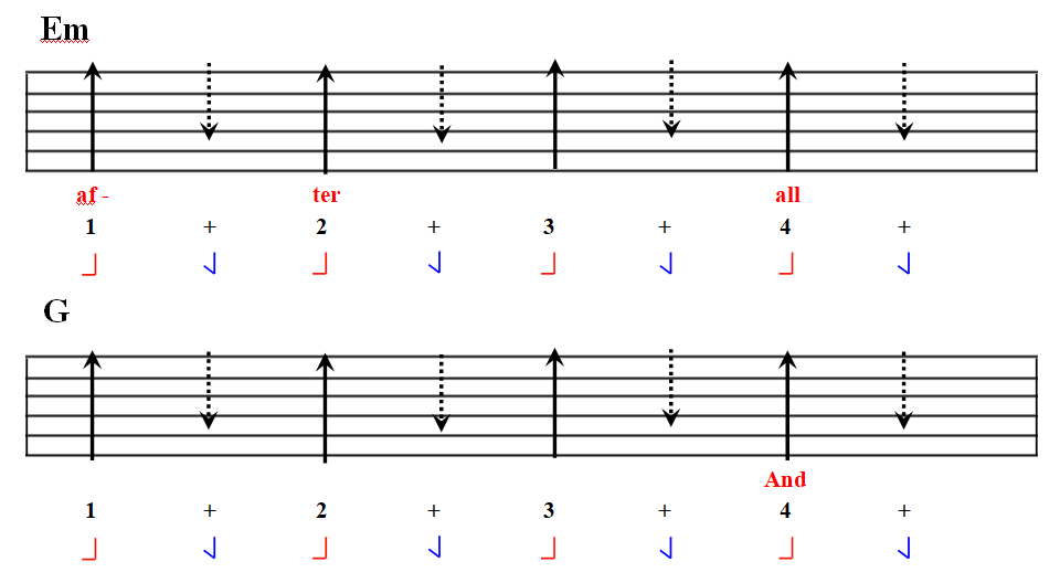 Looks pretty good all in. A couple of things I've spotted in there which should help strengthen further: 1) You've got an interesting mix going on. The strum and foot are what we're after for the semiquaver strum but the count you're moving in time with is in 8th notes. i.e. your strum and foot match the lower line shown below but the count is from the top line: